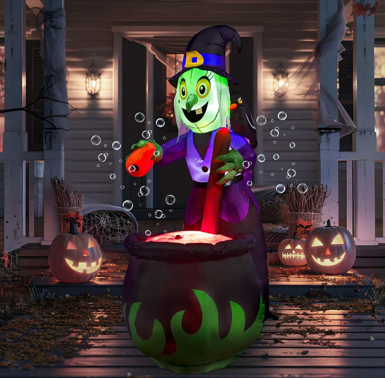 Featuring a witch and a mystical inflatable cauldron, this set embodies timeless Halloween spirit. The built-in bubble machine releases swirling bubbles, creating a cauldron that looks alive with brewing potions—ideal for amplifying your halloween decorations inflatables’ spook factor. Item dimensions L x W x H: 13.39 x 11.1 x 6.54 inches